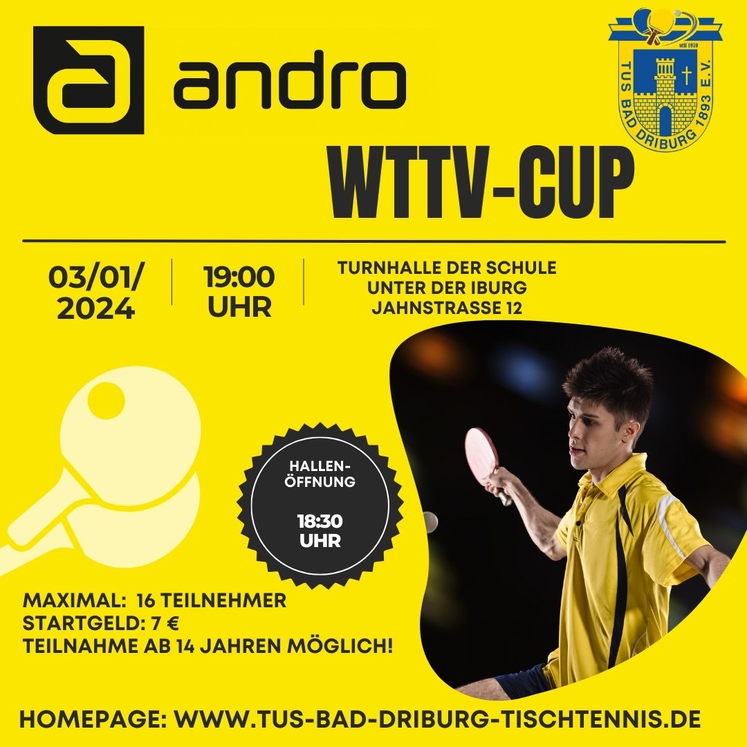 Es geht wieder los! Ab Januar startet wieder die Andro WTTV-Cup Serie und der TuS Bad Driburg ist als Ausrichter natürlich wieder dabei! Los geht es am 03. Januar um 19 Uhr in der bekannten Sporthalle der Grundschule „Unter der Iburg“ in der Jahnstraße 12.