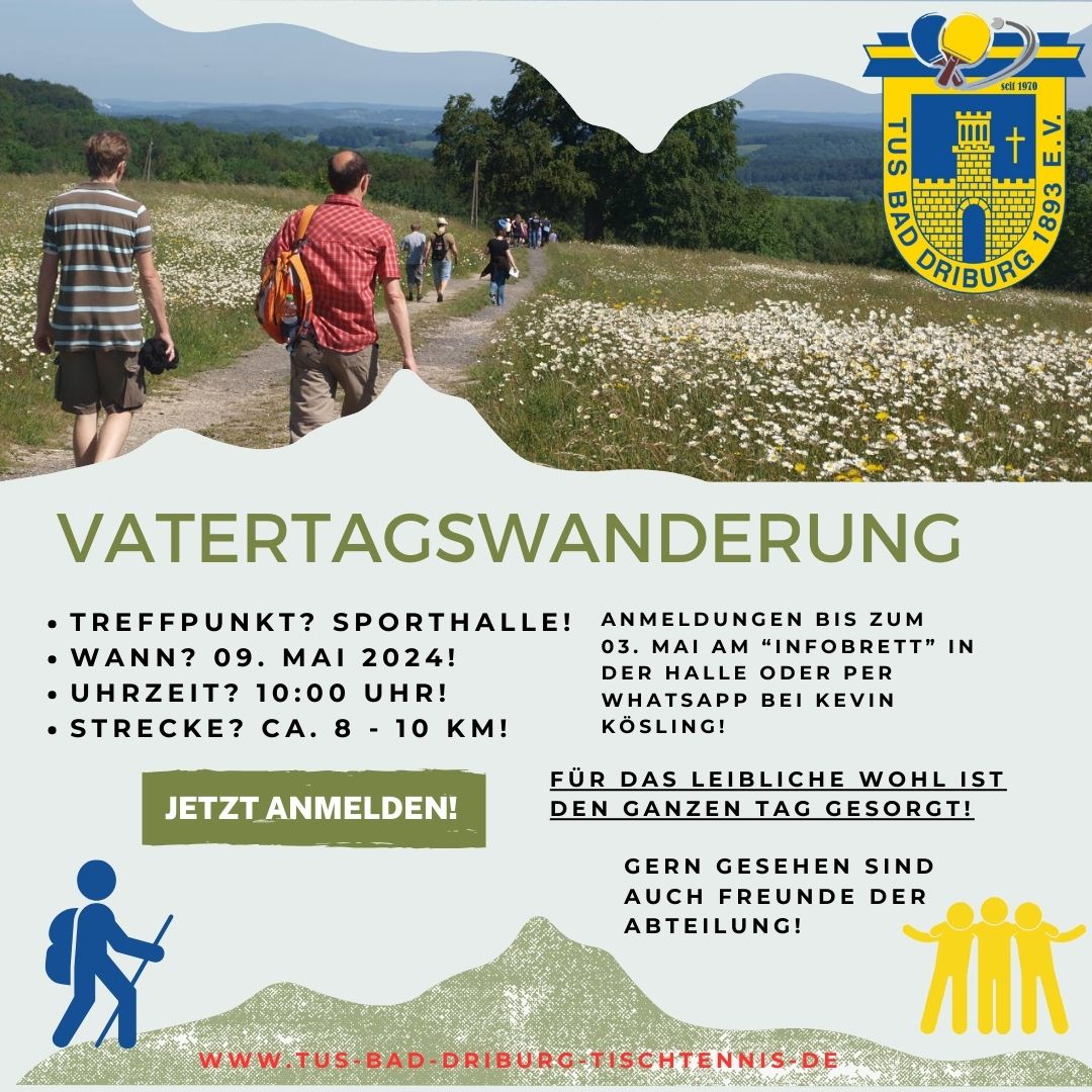 Auch in diesem Jahr steht die allseits beliebte Vatertagswanderung auf dem Programmzettel der Tischtennisabteilung. Hierzu sind alle Mitglieder der Abteilung mit ihrer besseren Hälfte, sowie Familien und Freunde recht herzlich eingeladen. Auch Freunde & Bekannte der Abteilung dürfen sich gerne anmelden und einen unvergesslichen Tag verbringen!