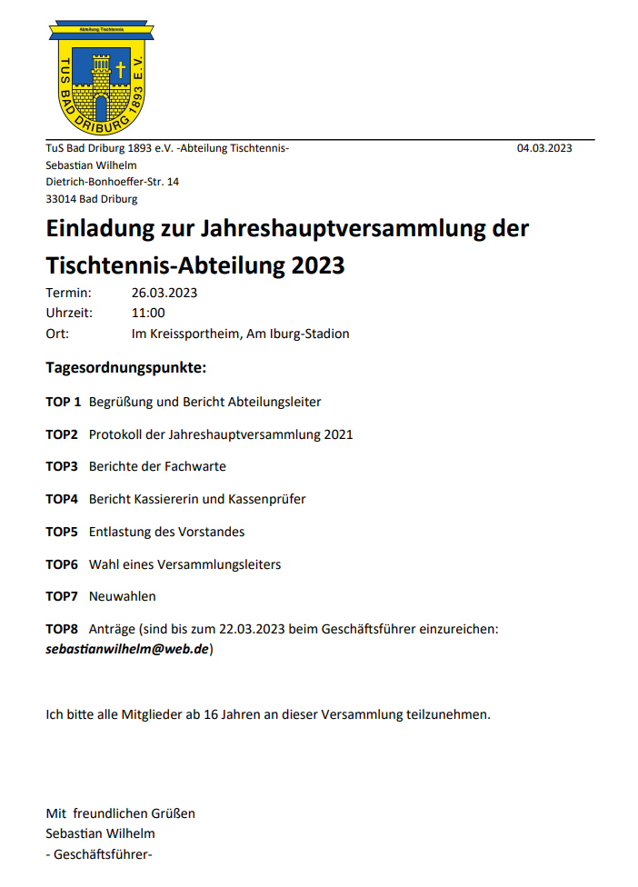 Auch dieses Jahr steht wieder die allseits beliebte Vatertagswanderung auf dem Programmzettel der Tischtennis Abteilung. Hierfür sind alle Mitglieder mit ihrer besseren Hälfte, deren Freunde oder Familie natürlich recht herzlich eingeladen!